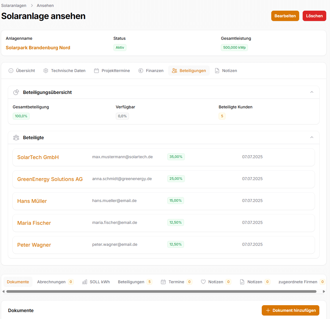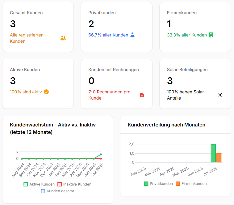 Verwalten Sie mühelos alle Beteiligungen an Ihren Solaranlagen. Automatische Ertragsverteilung, transparente Abrechnungen und präzise Verwaltung von Firmen- und Privatkundenbeteiligungen in einem zentralen System.